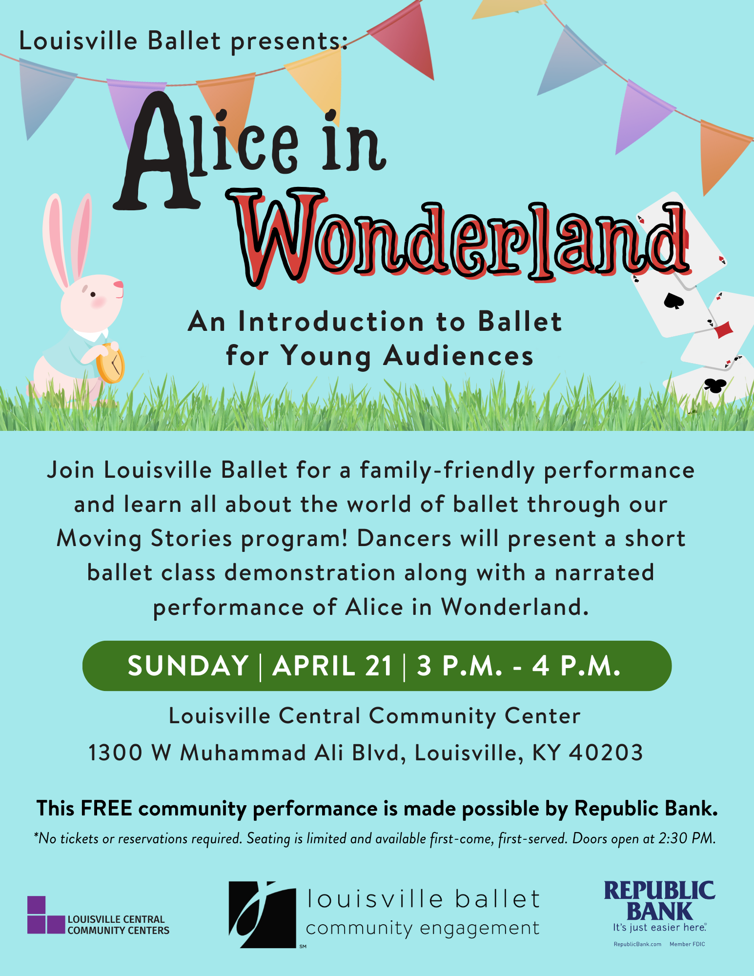 Join dancers from The Louisville Ballet Studio Company for a FREE family-friendly performance! Moving Stories: Alice in Wonderland is an interactive program that introduces young audiences to the art of ballet through a short ballet class demonstration, a performance of Alice in Wonderland, and an opportunity for select audience members to participate on stage. In partnership with Louisville Central Community Center and Republic Bank, Louisville Ballet is pleased to bring this fun and engaging program to families this spring!