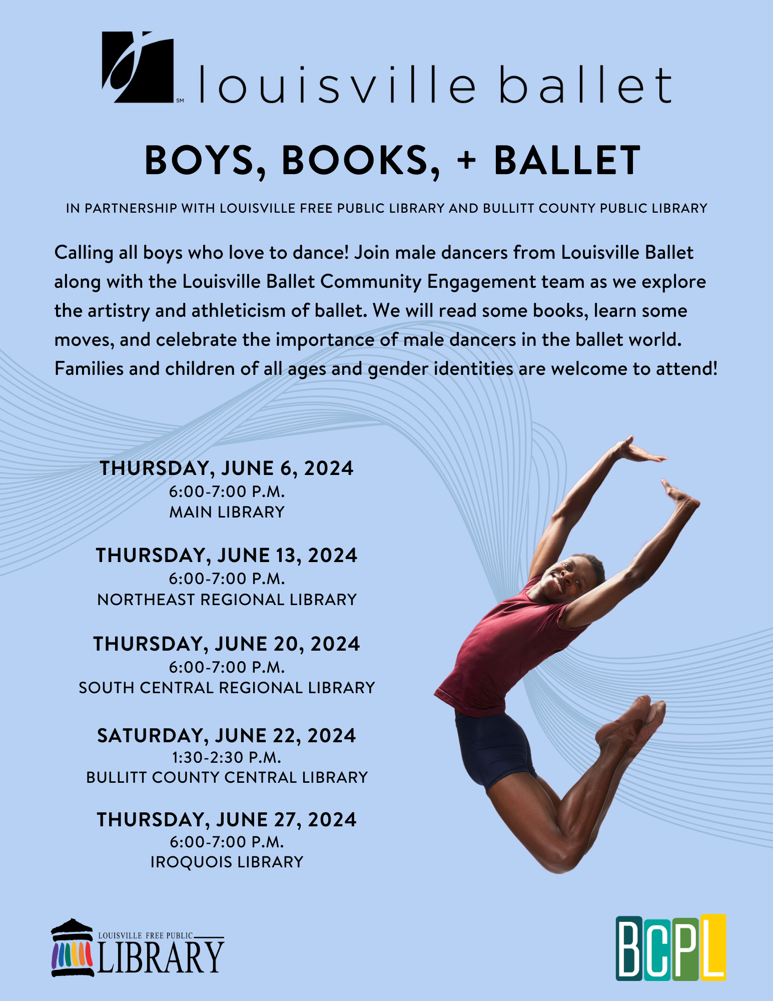 Join male dancers from Louisville Ballet along with the Louisville Ballet Community Engagement team as we explore the artistry and athleticism of ballet. We will read some books, learn some moves, and celebrate the importance of male dancers in the ballet world. Families and children of all ages and gender identities are welcome to attend.